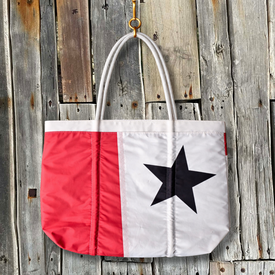 Our largest tote — fully lined, durable, and made from repurposed sailcloth and rescued materials. Built for bigger days and heavier loads. Purposeful, durable and entirely unique.